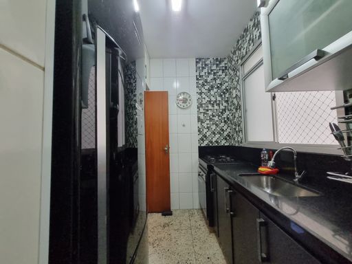 Apartamento com sala ampla para dois ambientes, varanda com fechamento de vidro, cozinha planejada com armários, área de serviço com armários planejados, três quartos sendo uma suíte todos com guarda-roupas planejados e banho social com armário e vidro box.