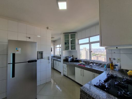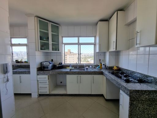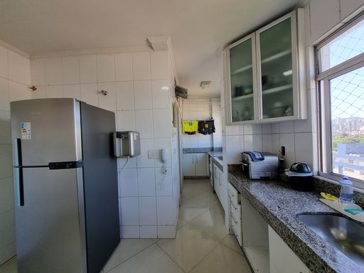 Apartamento com sala ampla para dois ambientes, três quartos com guarda-roupas planejados, um com suíte, e um com varanda, banho social com box e armário, cozinha com armários planejados, área de serviço separada da cozinha + quarto e banho de serviço.