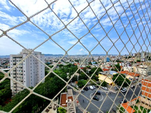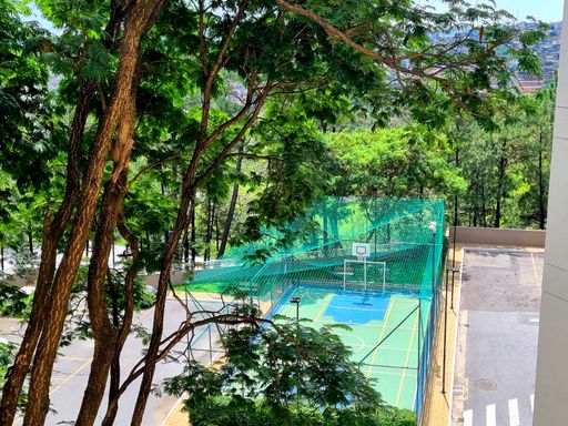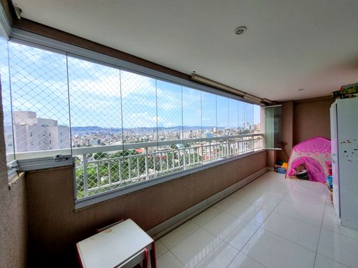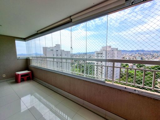Ampla varanda toda fechada com cortina de vidro e uma bela vista da área verde do condomínio;