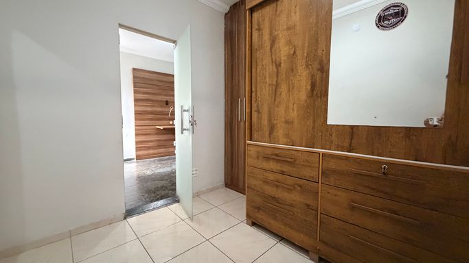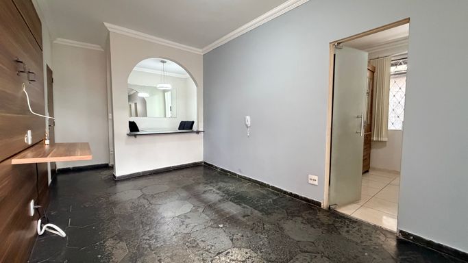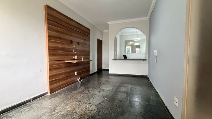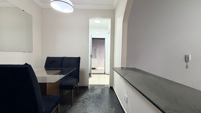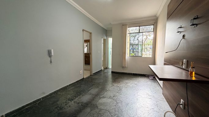 Apartamento com sala ampla, copa com mesa, área privativa com teto retrátil, dois quartos com guarda-roupas e um com cama (é possível retirar), banho social com box, cozinha com armários planejados e uma vaga de estacionamento.