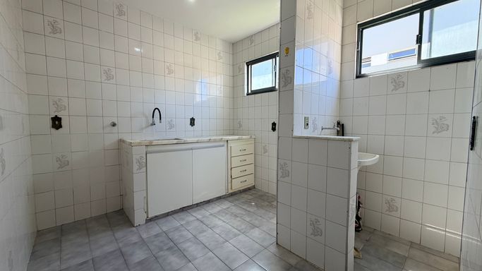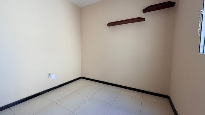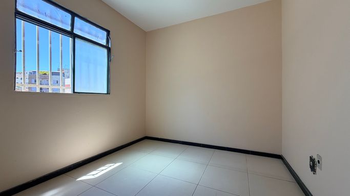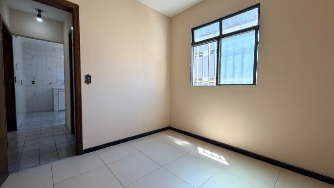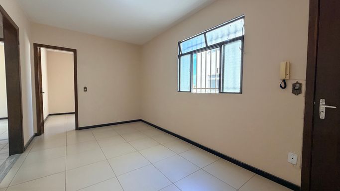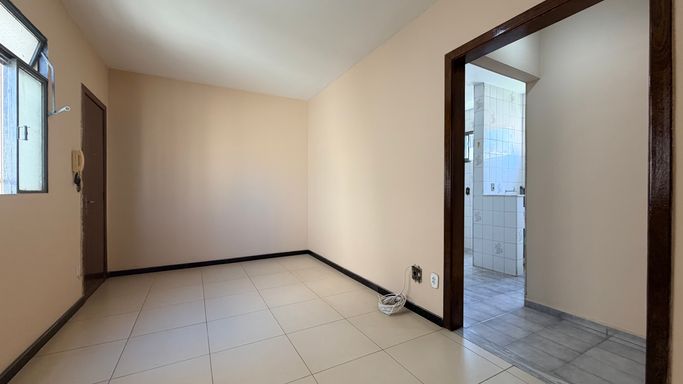 Apartamento com sala ampla para dois ambientes, cozinha com área de serviço, dois quartos e banho social com box de acrílico.