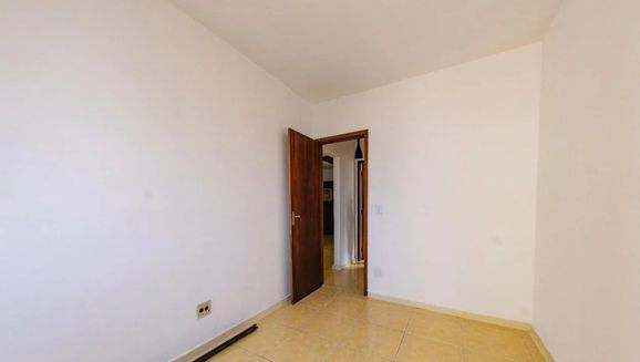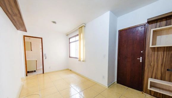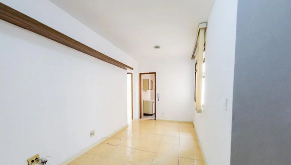 Apartamento com sala ampla para dois ambientes com painel rack planejado, cozinha com armários, área de serviço, dois quartos e banho social.