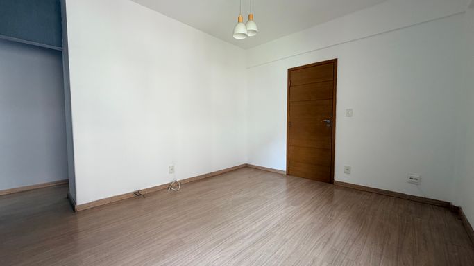 Apartamento com sala ampla para dois ambientes, cozinha com armários e bancada em granito, área de serviço individual, três quartos com guarda-roupas e banho social com box.