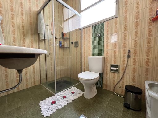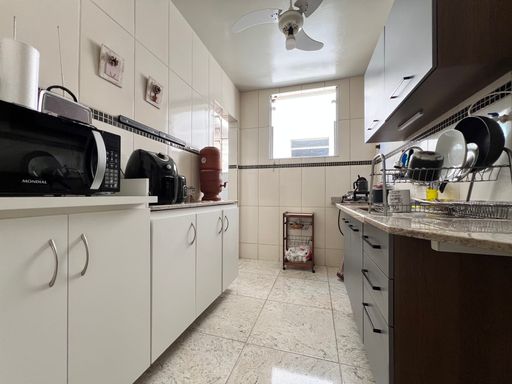 Apartamento com sala ampla para dois ambientes, três quartos sendo dois com guarda-roupas, banho social com vidro box, cozinha, lavabo, sala de jantar/copa, sala de estar e área privativa com lavanderia.