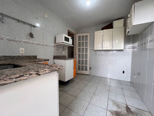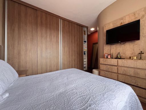 Varanda, sala ampla para dois ambientes, dois quartos sendo uma suíte com guarda-roupa, banho social, cozinha com armários e área de serviço independente.