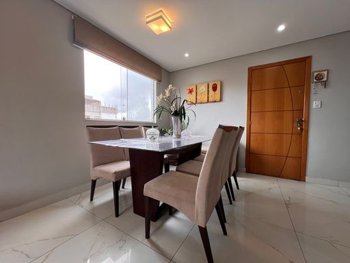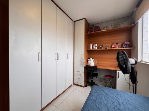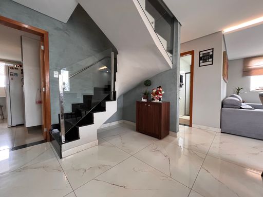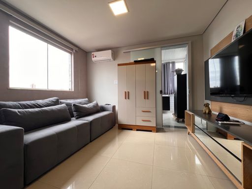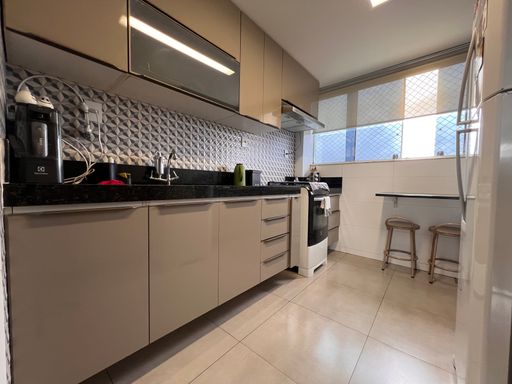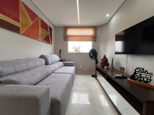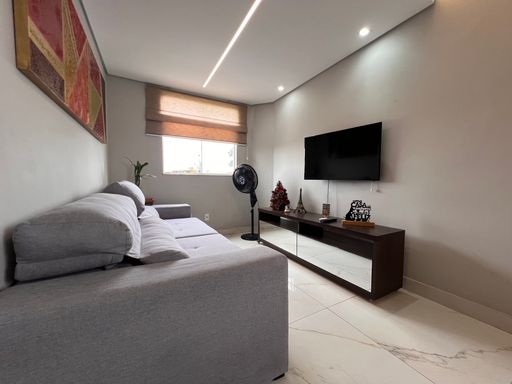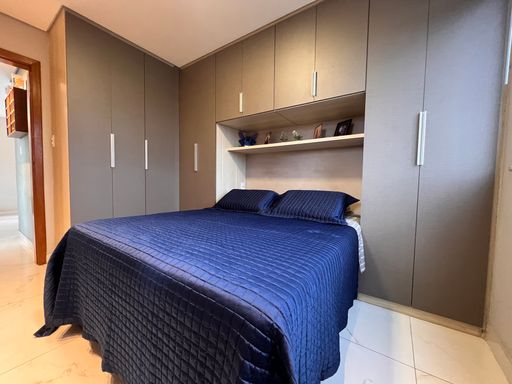 1º Pavimento: Sala ampla para dois ambientes com teto rebaixado em gesso e iluminação indireta, cozinha planejada com armários, dois quartos com guarda-roupas planejados sendo uma suíte e banho social com armário, espelho e vidro box.